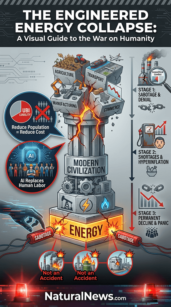 The simultaneous impact of open warfare and covert sabotage has one clear objective: to destroy the world’s hydrocarbon base. Why? Because energy is the foundation of everything. It is the prerequisite for modern agriculture, transportation, manufacturing, and commerce. As the book Fragile Foundations: Securing the Pillars of Modern Civilization warns, our dependence on centralized, complex systems is our greatest vulnerability. [6] Destroy the energy foundation, and you directly engineer famine, poverty, and societal collapse.